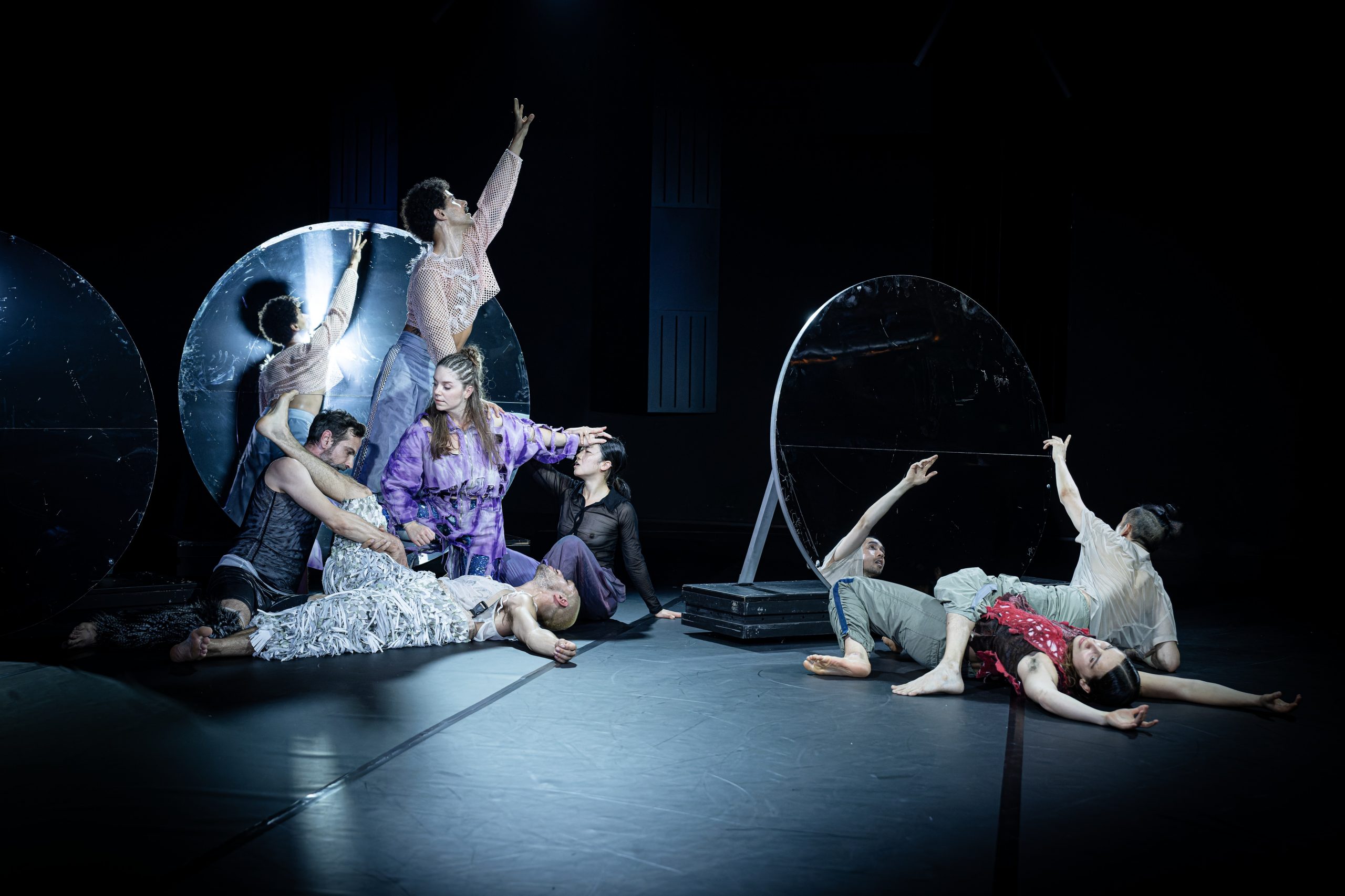 Choreography and direction: Ursina Tossi | Audio description: Anngret Schultze | Sound: Lena Geue | Co-creation and assistance: Diego de la Rosa | Set and costume: Lukas Noll | Dramaturgy: Caroline Rohmer | Consulting on audio description and accessibility: Isabella Brawata | Performers: Gustavo de Oliveira Leite, Pin-Chen Hsu, Borys Jaźnicki, Rose Marie Lindstrøm, Emma Jane Howley, Jeff Pham, and Omar Torrico. | Jumpers: Maja Mirek, Magdalena Stoyanova.