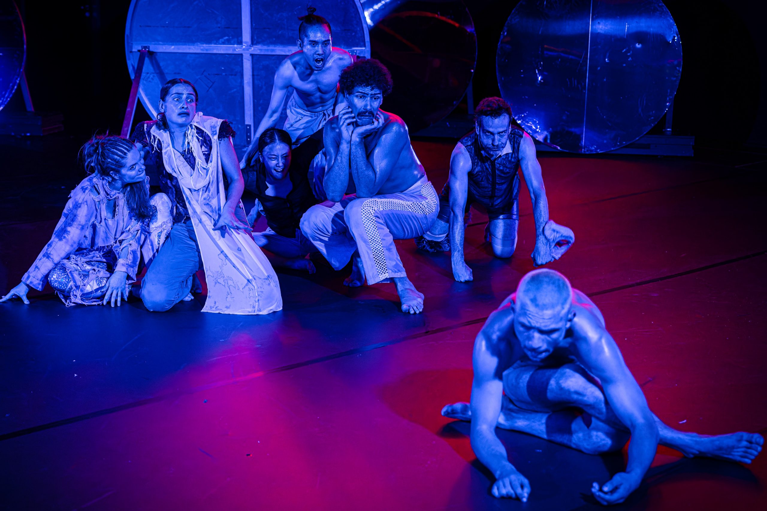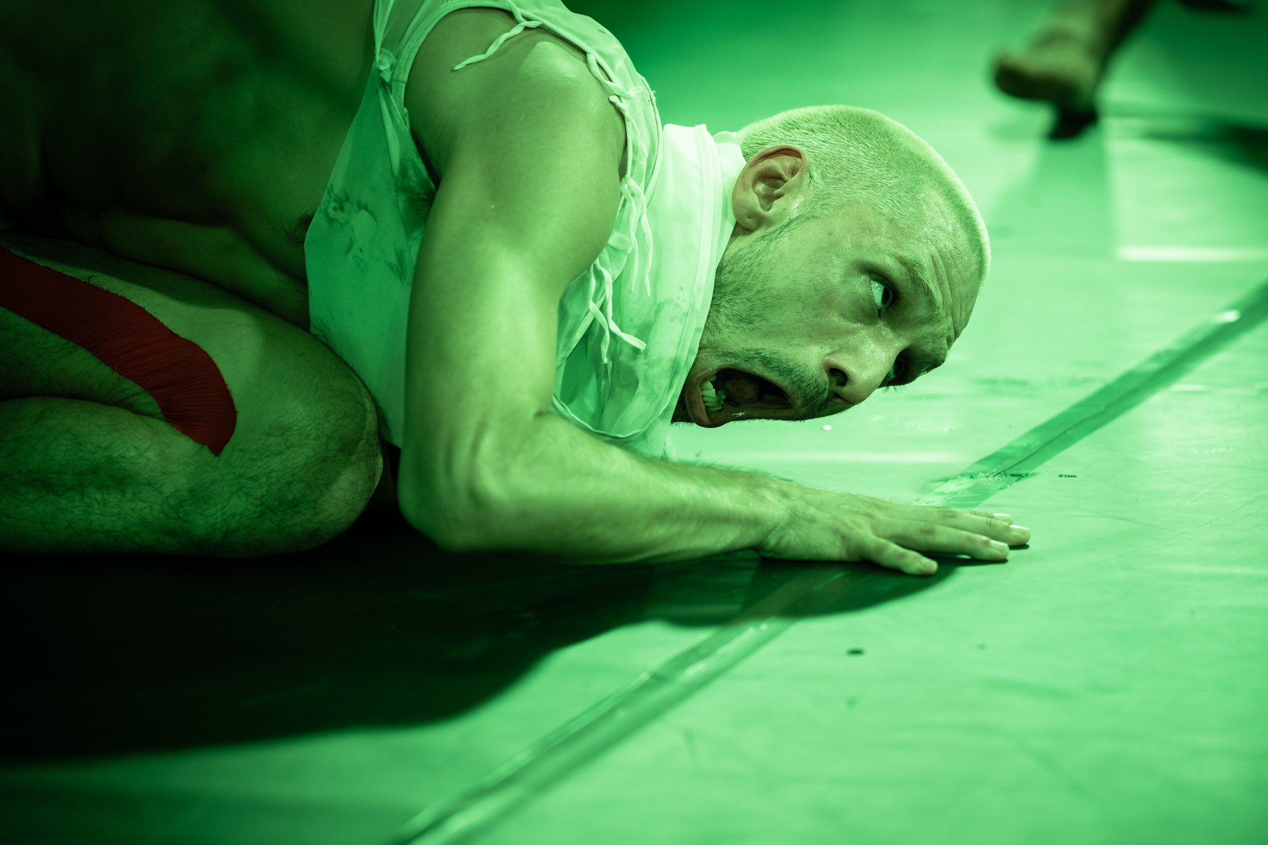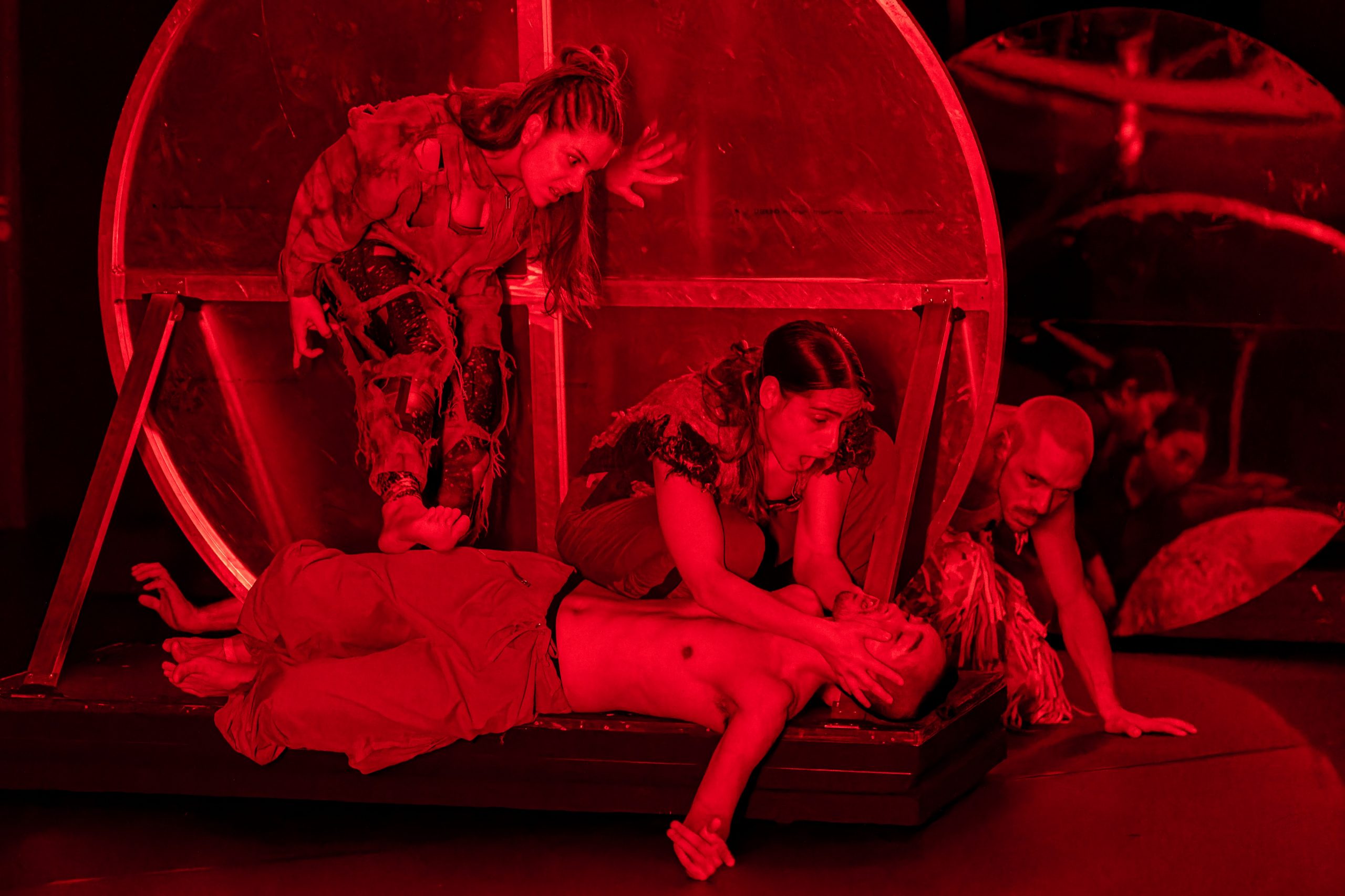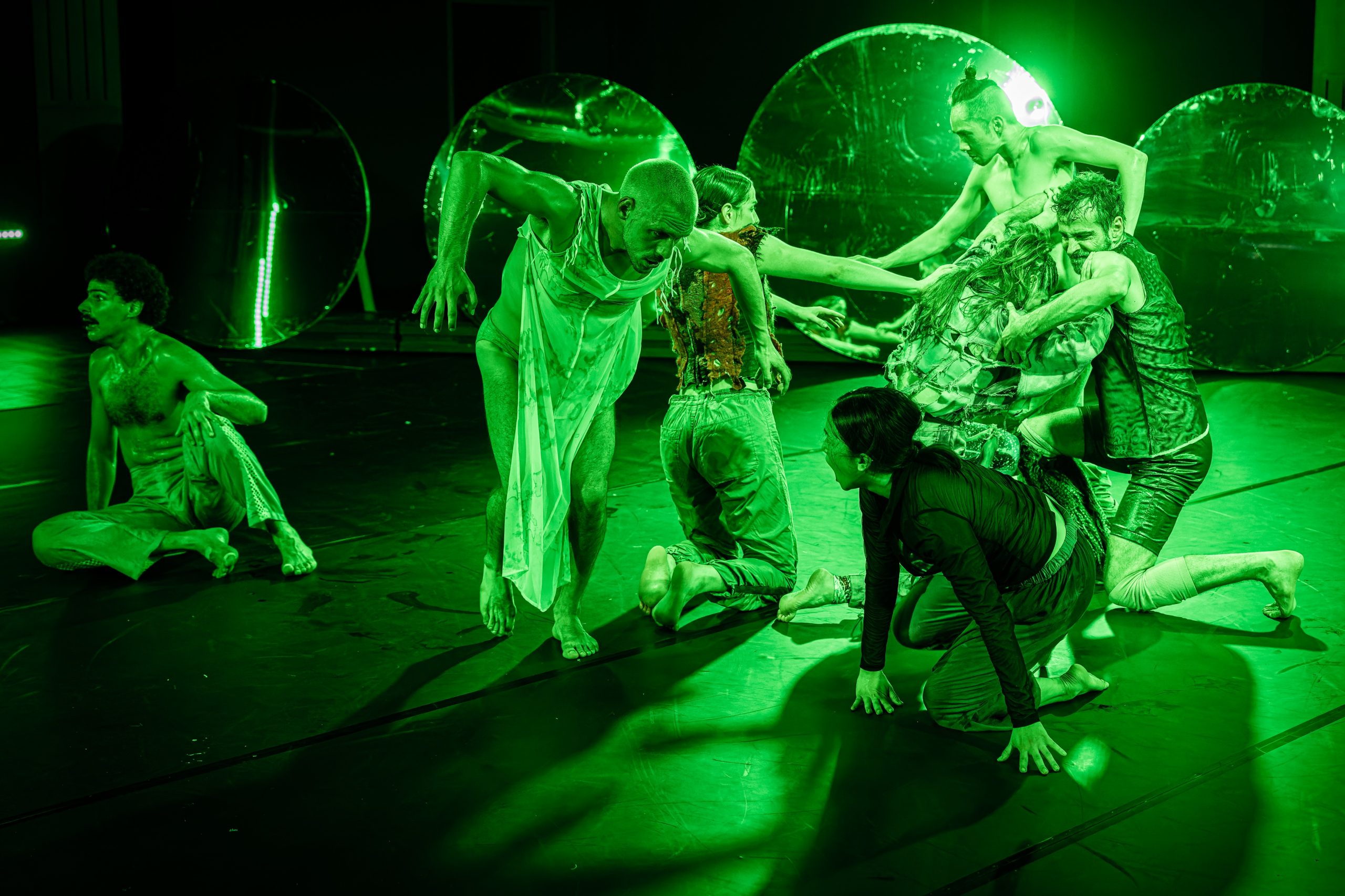 Climate catastrophes, wars, pandemics, collapsing democracies, right-wing threats— disaster piles on disaster! We stare at it, freeze, fall into escapist trances, or dream of virtual worlds. In Ghosts, it’s 5 past 12 – witching hour – and we see impossible stories about broken futures, marginalized and dispossessed bodies: phantom bodies, phantom property, phantom pain, phantom appropriation. Ghosts invites you to deal with the ghosts of patriarchy, the humanistic legacy and its necropolitics, as well as the traces of colonial capitalism on your own body, the images in our heads and possibly other worlds, and to deal with queer emancipatory spirits to band together. They are unruly characters who bring missed opportunities of the past to life and tell them further. Close to the audience and accompanied by an artistic audio description, there are horrifyingly fantastic encounters of a different kind, fluid collective moments of mourning, humorously erotic goosebumps, and bizarrely liberating visions from a tangibly distant future. Welcome to our bodies!